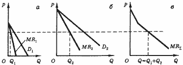 Рис. 2. Предельная выручка монополии на сегментированном рынке. а - на сегменте 1; б - на сегменте 2; в - на рынке в целом