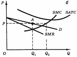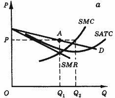 Рис. 1. Выбор оптимального объема производства в коротком периоде фирмой, максимизирующей свою прибыль (а) или минимизирующей убытки (б)