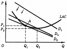 К такому же финалу приведет развитие событий и тогда, когда в начальный момент фирма несла экономические убытки. Только в этом случае компании будут сужать ассортимент убыточных товаров и кривая спроса для той фирмы, которая не покинет рынок, будет повышаться, пока тоже не займет положение касательной.