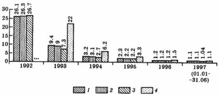 Рис. 2. Динамика цен на потребительском рынке РФ в 1992-1997 гг. (декабрь к декабрю предыдущего года, в разах). (По: Цены в России: Статистический сб. М., 1996; Россия в цифрах: Статистический сб. М., 1997). 1 - индекс потребительских цен; 2 - непродовольственные товары; 3 - индекс цен на продовольственные товары; 4 - на платные услуги населению.