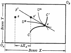 Весь смысл описываемых нами манипуляций состоит в том, чтобы посредством неискажающего трансферта поменять исходное распределение благ между индивидами, а далее конкурентный механизм сам собой, через стремление индивидов к максимизации полезности при заданных рынком ценах, превратит эту комбинацию в парето-эффективную (совершит переход из точки z' в точку е вдоль бюджетной линии). При этом ключевым является предположение о том, что неискажающее перераспределение возможно.