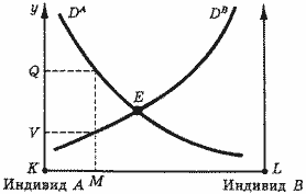 Будет ли это равновесие устойчивым и какие силы заставляют двигаться к точке равновесия? Положим, первоначальное распределение долей затрат между индивидами в точке М не соответствует равновесному и уровень общественных расходов, о котором договорились индивиды, равен V. Внося долю KМ от общей суммы расходов, индивид А предпочел бы более высокий уровень общественных расходов, а именно Q, но на рост расходов при сохранении существующих долей не согласится индивид В. Более высокий уровень расходов может быть достигнут только при взаимном согласии увеличить долю А и уменьшить долю В. Отметим, что движение может происходить только в сторону равновесия - уровень расходов V в любом случае более предпочтителен для обоих индивидов, чем меньшая величина расходов. В этом смысле равновесие по Линдалю устойчиво.