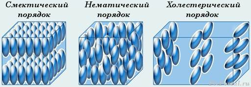 - холестерическая – молекулы располагаются параллельно друг другу в одной плоскости, но в разных плоскостях ориентации молекул разные