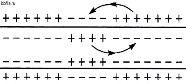 В аксоплазме, и в окружающем растворе возникают локальные токи: между участками поверхности мембраны с большим потенциалом (положительно заряженным) и участками с меньшим потенциалом (отрицательно заряженным).