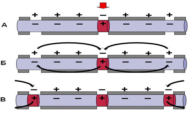 Рис. 2. Локальные токи при распространении нервного импульса по нервному волокну. (А – рефрактерность; Б – возбуждение; В – покой).