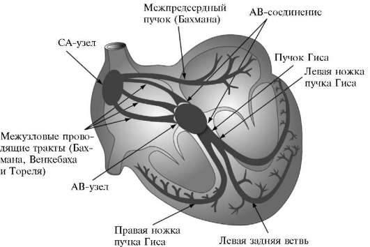 Синусно-предсердный (синоатриальный) узел и предсердно -желудочковый узел — водители ритма сердца. От предсердно- желудочкового узла – берет начало предсердно-желудочковый пучок (пучок Гиса), который прободает предсердно-желудочковую перегородку и разветвляется на правую и левую ножки, которые следуют вдоль межжелудочковой перегородки. В области верхушки сердца ножки пучка пучка Гиса загибаются вверх и переходят в сердечные приводящие миоциты (волокна Пуркинье), которые охватывают рабочий миокард желудочков.