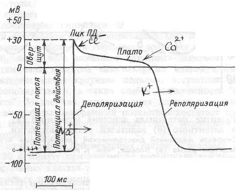 Деполяризация мембраны активирует медленные натрий-кальциевые каналы. Поток Ca+ внутри клетки по этим каналам приводит к развитию плато потенциала действия – фаза 2, в этот период натриевые каналы инактивируются и клетка переходит в состояние абсолютной рефрактерности. Одновременно активируются калиевые каналы. Выходящий из клеток поток К+ обеспечивает быструю реполяризацию мембраны (фаза 3), во время которой кальциевые каналы закрываются, что ускоряет процесс реполяризации, так как падает входящий кальциевый поток.