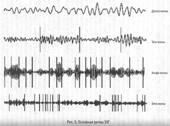 В состоянии активной деятельности наблюдается бета-ритм с частотой 14-35 Гц. Во время сна дельта – ритм—0,5- 3,5 Гц. Гамма-ритм –35—70 Гц.