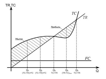 - несет убытки, производя продукцию в объеме (0 - Q3), когда совокупные издержки больше совокупного дохода (ТС > ТR). Предприятие будет работать, даже неся убытки, если эти убытки меньше постоянных издержек – издержек, которые она имела бы даже при нулевом выпуске;
