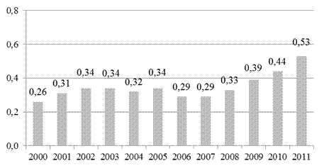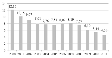 Одним из самых простых измерителей уровня доступности жилья является покупательская способность заработной платы на жилищном рынке (I1), которая определяется отношением среднемесячной номинальной начисленной заработной платы работников к средней рыночной стоимости 1 кв. метра жилья. Динамика значений данного показателя для России в 2000-2011 гг. представлена на рисунке 5.1.