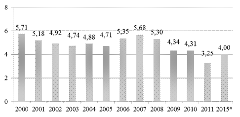 * 2015 г. – целевой индикатор Федеральной целевой программы (ФЦП) «Жилище» на 2011-2015 гг.