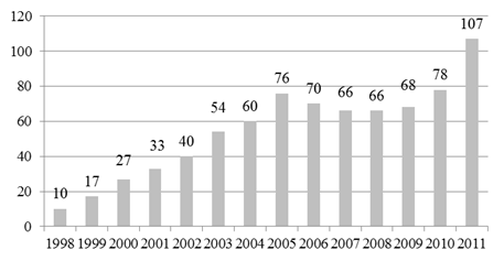 Индекс доступности жилья с кредитом показывает соотношение доходов среднестатистического домохозяйства с доходами, которые необходимо иметь для приобретения стандартной квартиры с помощью ипотечного кредита, выдаваемого на стандартных условиях. Значение показателя в 100% означает, что среднестатистическая семья имеет доходы, в точности соответствующие необходимым доходам для приобретения стандартной квартиры с помощью ипотечного кредита. Значение показателя, к примеру, в 70% означает, что у домохозяйства есть только 70% дохода, необходимого для приобретения квартиры с помощью ипотечного кредита. Динамика значений данного показателя для России за период 1998-2011 гг. представлена на рисунке 5.4.