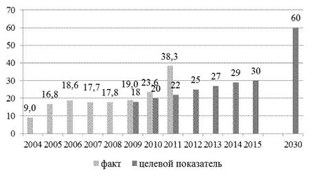 Доля домохозяйств с совокупным доходом выше минимального определяется исходя из данных о распределении домохозяйств по уровню среднемесячного дохода. Ввиду отсутствия официальных данных о распределении домохозяйств по уровню среднемесячного дохода используются данные о распределении населения по уровню среднедушевого месячного дохода, с которым сравнивается минимальный совокупный доход семьи из трех человек в расчете на одного члена семьи. Динамика значений доли семей, имеющих возможность приобрести жилье, соответствующее стандартам обеспечения жилыми помещениями, с помощью собственных и заемных средств для России за период 2004-2011 гг. и прогнозный период представлена на рисунке 5.5.
