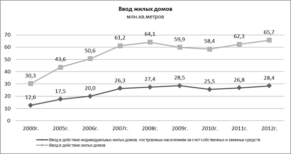 Объемы ввода жилья в течении 2006-2008 гг. ежегодно возрастали, с 2009 г. было отмечено снижение ввода общей площади жилья по сравнению с предыдущим годом на 6,5%, в 2010 г. – на 2,4%, в 2011г. объёмы строительства увеличились на 6,6% по сравнению с 2010 г. и в 2012 г. – на 5,6%.