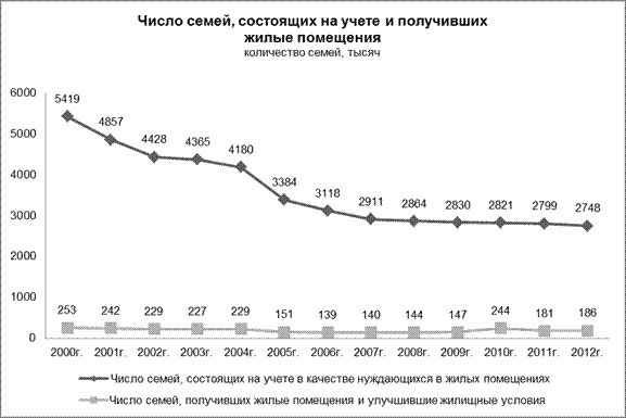 Общее число семей, состоящих на учете в качестве нуждающихся в жилье за 2012 г. сократилось на 1,8% и на 1 января 2013 г. составило 2,7 миллиона.