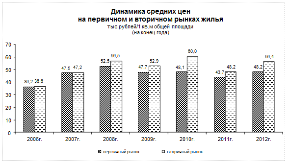 Важным фактором, влияющим на уровень доступности жилья гражданам является рост цен на жилье как на первичном, так и на вторичном рынках. Средние цены 1 кв.метра общей площади проданных квартир по Российской Федерации на конец IV квартала 2012г. на первичном рынке жилья составили 48,2 тыс. рублей, на вторичном - 56,4 тыс. рублей. По сравнению с концом предыдущего года цены на жилье на первичном рынке выросли на 10,7%, на вторичном - на 12,1%.