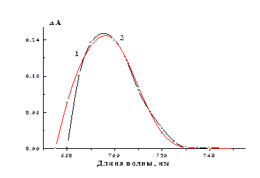 | Дифференциальные спектры цис-изомера красителя, изме-ренные при прямом (1) и сен- сибилизированном (2) воз- буждении через 3,5.10-4 и 1,1.10-3 с после фотоимпульса соответственно |