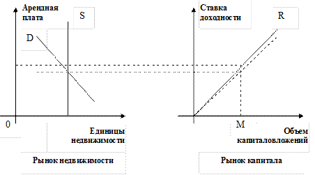 D – линия спроса; S – линия предложения; R – ставка доходности инвестированного капитала; М – объем капиталовложений в недвижимость при данной ставке доходности