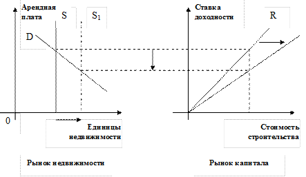 Для равновесного рынка недвижимости характерен стабильный объем предложения недвижимости, поскольку нет побудительных причин для вложения капитала в строительство объектов недвижимости. Изменения на рынке недвижимости начинаются с роста ставки доходности на рынке капитала. Если растет ставка доходности инвестиций в недвижимость на рынке капитала, растет инвестиционная привлекательность недвижимости, что вызывает приток капитала в строительство новых объектов недвижимости. Рост объемов предложения на рынке недвижимости является результатом оживления на рынке капитала и притока капитала в строительство.