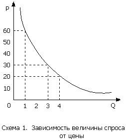 Если мы рассмотрим ситуацию, складывающуюся на рынке какого-нибудь товара, то легко заметим, что между ценой товара и количеством проданного (реализованного) товара существует определенная связь. Чем ниже цена товара, тем большее его количество (при прочих равных условиях) готовы купить покупатели, тем выше на него спрос. Например, при цене в 60 тенге покупатели готовы купить лишь одну единицу блага Х, при цене в 30 тенге - три единицы, при цене в 20 тенге - четыре единицы и т.д. Обратная зависимость между ценой и величиной спроса называется законом спроса (law of demand). Эта зависимость количества проданных благ от уровня цен может быть изображена графически. Кривая спроса (demand curve) – кривая показывающая, какое количество экономического блага готовы приобрести покупатели по разным ценам в данный момент времени. В экономической теории принято откладывать независимую переменную (цену) по вертикальной, а зависимую (спрос) - по горизонтальной оси (см. схему № 1).