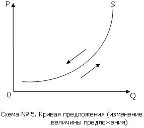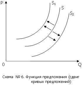 Функция предложения (supply function) oпpeделяет предложение в зависимости от влияния различных факторов. Как мы уже выяснили, важнейшим из них является цена на единицу блага в данный момент времени. Изменение цены означает движение по кривой предложения (см. схема № 5). В действительности на предложение блага влияют не только цены самого блага, но и другие факторы: 1) цены факторов производства (ресурсов), 2) технология, 3) ценовые и дефицитные ожидания агентов рыночной экономики, 4) размер налогов и субсидий, 5) количество продавцов.