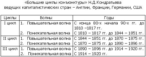 г) в период повышательной волны больших циклов средние капиталистические циклы характеризуются краткостью депрессий и интенсивностью подъемов; в период понижательной волны больших циклов наблюдается обратная картина».