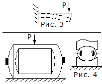 Упругие силоизмерители – например балочный силоизмеритель – рис.3. Измеряемая сила пропорциональна прогибу, который меряется либо часовыми индикаторами, либо тензорезисторами. Также бывают сложные упругоизмерители – рамы – рис.4, либо деформируемые элементы с наклеенными тензорезисторами (шарик –рис.4).