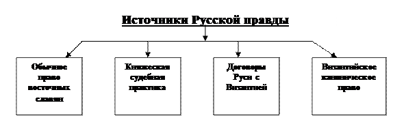 1-й период. Древнейшим источником права является обычай. Он не может возникнуть в результате деятельности отдельных личностей и является обязательной нормой именно потому, что признается всем народом. Обычай – это правило поведения, сложившееся исторически, на протяжении жизни нескольких поколений, ставшее всеобщим в результате многократного повторения. Но с развитием общества эти обычаи начинают охраняться не самими соплеменниками, а выделяемыми из их состава органами управления (вождями, дружинниками, жрецами) т. е. они переходят в разряд обычаев правовых, и таким образом появляется обычное право. Ярчайшими его проявлениями в Древнерусском государстве являлись круговая порука и кровная месть.