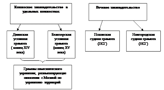 X – XI века дали нам несколько законодательных памятников, среди которых наиболее примечательны Устав Владимира Святославича о судах церковных и десятине, Судный закон людем (его же), Устав Ярослава о судах церковных, Русская правда разных редакций.