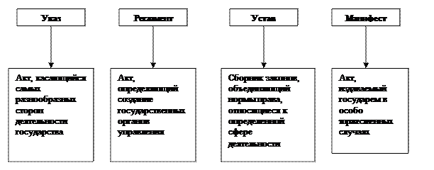 - в связи со свержением императорской власти (Февраль 1917 года) основными формами законодательных актов Временного правительства стали: положения, воззвания, декларации. Были отменены Основные законы Российской империи.