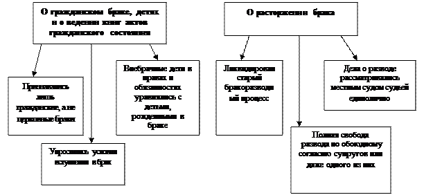 Советское государство осуществило подлинную революцию в области семейного права. Церковь была отделена от государства, и поэтому сразу после революции были приняты два важнейших декрета (декабрь 1917 года).
