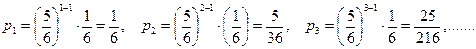 Пример 2. Игральная кость подбрасывается до первого выпадения цифры шесть. Составить закон распределения числа подбрасываний игральной кости до первого выпадения цифры шесть.