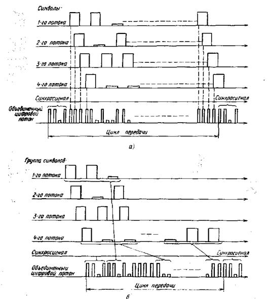 Рисунок 19 - Формирование группового цифрового сигнала различными способами объединения цифровых потоков: а — посимвольный; б — поканальный