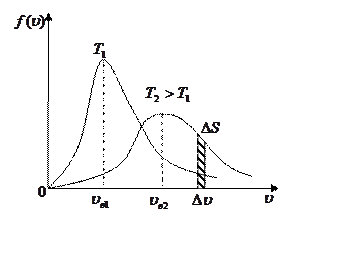 С повышением температуры максимум распределения сдвигается в сторону больших скоростей, а кривая становится более пологой, однако площадь под кривой не изменяется, т.к. Sобщ.= 1.