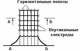 Выравнивание потенциала. Этот метод находит применение при работах на линиях электропередач, подстанциях. На подстанциях высокого напряжения выравнивание потенциалов осуществляется расположением заземлителей по контуру вокруг заземленного оборудования на небольшом расстоянии друг от друга, а внутри контура прокладывают в земле горизонтальные полосы (рис. 12).
