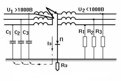 Защита от опасности перехода напряжения с высшей стороны на низшую. Появление в сети напряжения, намного превышающего номинальное, может привести как к выходу из строя токоприемников, изоляция которых не рассчитана на это напряжение, так и к поражению персонала током, так как при этом обычно происходит замыкание на корпус и появляются опасные напряжения прикосновения и шага.