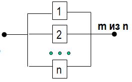 Рассмотрим общий случай схем параллельного соединения n элементов – схему “m из n” (рис.6). Такая схема считается работоспособной пока работают хотя бы m элементов из n. Отказом схемы является отказ минимум n-m+1 ее элементов, т.е. n-m+1,n-m+2, …, n: