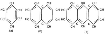 Они относятся к циклическим углеводородам и, в отличие от нафтеновых, содержат в каждом цикле три двойные связи. В нефтях содержатся арены с числом циклов от 1 до 4. Арены, содержащиеся в бензинах, являются гомологами бензола (а); в керосинах и дизельных топливах, кроме гомологов бензола, содержатся производные (гомологи) нафталина (б), а в маслах — гомологи нафталина и антрацена (в).