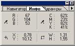 Палитра Инфо показывает цвет текущего пикселя изображения в режиме RGB и CMYK, а так же координаты курсора относительно начала координат