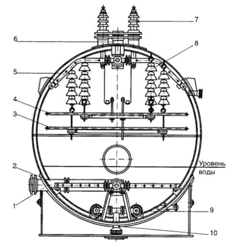 1 – штуцер ввода сырья 2 – нижний распределитель сырья 3 - нижний электрод; 4 — верхний электрод; 5 — верхний сборник обессоленной нефти; 6 — штуцер вывода обессоленной нефти; 7 — штуцер проходного изолятора; 8 — подвесной изолятор; 9 — дренажный коллектор; 10 — штуцер вывода соленой воды