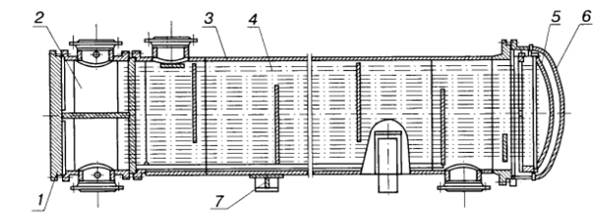 1 — крышка распределительной камеры; 2 — распределительная камера; 3 — кожух; 4 — теплообменная труба; 5 — крышка плавающей головки; 6 — крышка кожуха; 7 — опора