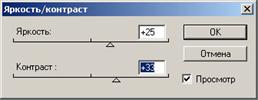 Коррекция яркости и контрастности изображения производится с помощью применения меню Изображение - подменю Настройка - команды Яркость/Контраст.