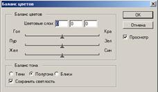 Изменить цветовой баланс изображения можно с помощью меню Изображение - подменю Настройка - команды Баланс цвета. Перемещая регулятор в сторону предложенных цветов изменяем общий цветовой баланс изображения.