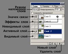 Для того чтобы сделать слой активным щелкните мышью на имени нужного слоя в палитре. Чтобы временно спрятать слой, щелкните мышью на значке Глаз напротив его миниатюры. Чтобы вновь сделать слой видимым, щелкните мышью еще раз. Если щелкнуть в палитре слои между значком Глаз и миниатюрой слоя установится значок Связь.