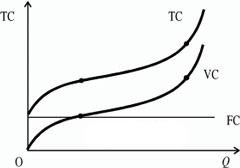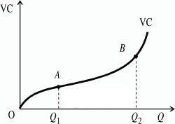 ), затем достигается экономия переменных издержек при массовом производстве, и скорость их роста уменьшается (до достижения точки