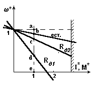 Отличие этого способа от ранее рассмотренного состоит в том, что в первом случае при идеальном холостом ходе двигателя напряжение на якоре равно напряжению сети для всех реостатных характеристик и не зависит от сопротивления якорной цепи. В шунтировочной схеме при Мс = 0 напряжение на якоре двигателя меньше напряжения сети и поэтому скорость идеального холостого хода снижается в зависимости от соотношения сопротивлений Rд и Rш.