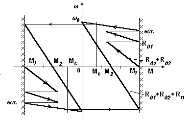 Построив естественные характеристики и назначив М1 £ Мдоп, подбирают искусственные характеристики так, чтобы М2 > Мс; в примере указаны две пусковые (Rд1 и Rд1 + Rд2) и одна тормозная (Rд1 + Rд2 + Rп) характеристики. Контакты контакторов В и Н определяют направление вращения, контакты К1, К2 и Кп, размыкаясь, вводят в цепь соответствующие резисторы. Стрелками на диаграмме указан ход процессов пуска и реверса. Резисторы Rд1, Rд2 и Rп могут использоваться и в целях регулирования скорости.