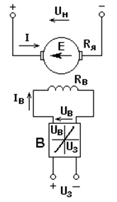 | Рис. 3.17. Схема электропривода с регулированием скорости изменением магнитного потока | Рис. 3.18. Типичная кривая намагничивания машины постоянного тока |