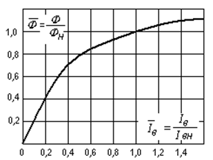 Схема включения двигателя для регулирования скорости изменением магнитного потока приведены на рис. 3.17. Будем полагать, что якорная цепь двигателя без каких-либо добавочных резисторов подключена к источнику с напряжением U = Uн, а цепь возбуждения питается от усилителя - возбудителя В (рис. 3.17) или в простейшем случае от того же источника через добавочный резистор. Нормальные электрические машины рассчитаны таким образом, что номинальному току возбуждения соответствует магнитный поток на колене кривой намагничивания. Типичная усредненная кривая намагничивания для ряда машин показана на рис. 3.18. Так как Iвн соответствует допустимому нагреву обмоток возбуждения, то при регулировании скорости в условиях продолжительной работы ток возбуждения можно только уменьшать.