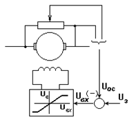При питании якорной цепи от неуправляемого источника тока (I=const) электропривод, как отмечалось, обладает свойством управляемого по цепи возбуждения “источника момента”, т.е. имеет в разомкнутой структуре вертикальные механические характеристики. Это обстоятельство очень удобно для построения замкнутых структур: исключение действия ЭДС вращения позволяет просто формировать любые характеристики посредством использования соответствующих обратных связей. Покажем это на простых примерах. В схеме на рис. 3.23,а отрицательная обратная по скорости включена на возбудитель, имеющий характеристику с ограничением; напомним, что установленная мощность возбудителя много меньше мощности двигателя. В предположении, что характеристики Ф(Uв) и Uв(Uвх) на рабочих участках линейны, имеем: